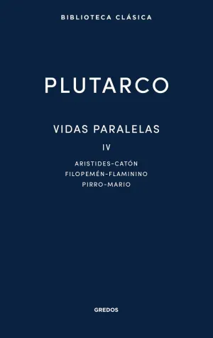 Historiador, filósofo y moralista, Plutarco nos legó uno de los conjuntos literarios más extraordinarios de la Antigüedad: las Vidas paralelas. Bajo este título se reúne una extensísima recopilación de biografías de algunos de los hombres más sobresalientes de la historia antigua. En estas obras, Plutarco trasciende el relato histórico para también transmitir mensajes morales y llegar al alma de estos grandes personajes presentados siempre por parejas (uno griego y otro romano).El cuarto volumen de Vidas paralelas recoge las vidas de: Aristides-Catón, Filopemén-Flaminino, Pirro-Mario. En todas ellas, Plutarco hace gala de sus habituales líneas de trabajo (descripciones físicas y convicciones morales de los protagonistas, anécdotas ilustrativas de sus vidas, grandes momentos de triunfo y fracaso, así como virtudes y defectos de sus personalidades). El resultado es, como siempre, unas biografías de una extraordinaria riqueza y una fascinante complejidad tanto narrativa como de carácter.